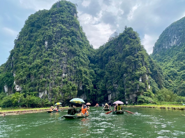 Ninh Binh ist als die „Ha Long Bucht“ auf dem Festland bekannt – da wir, aufgrund einer Taifun-Warnung die Ha Long Bucht nicht besuchen konnten, haben wir uns für Ninh Binh entschieden. Und fanden es traumhaft! Grün bewachsene Kalksteinfelsen, Reisfelder, Flüsse, die sich ihren Weg durch die Felsen bahnen…
