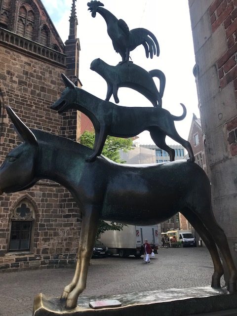 Die Bronzeplastik der Bremer Stadtmusikanten stammt von Gerhard Marck aus dem Jahre 1951 und dient wie so viele Bronzestatuen anderer Städte als Glücksbringer. Dazu muss man beide Vorderläufe des Esels gleichzeitig anfassen. Hier unbedingt einen Fotostopp einlegen! Und überhaupt begegnet man in der Stadt den Bremer Stadtmusikanten sehr häufig.