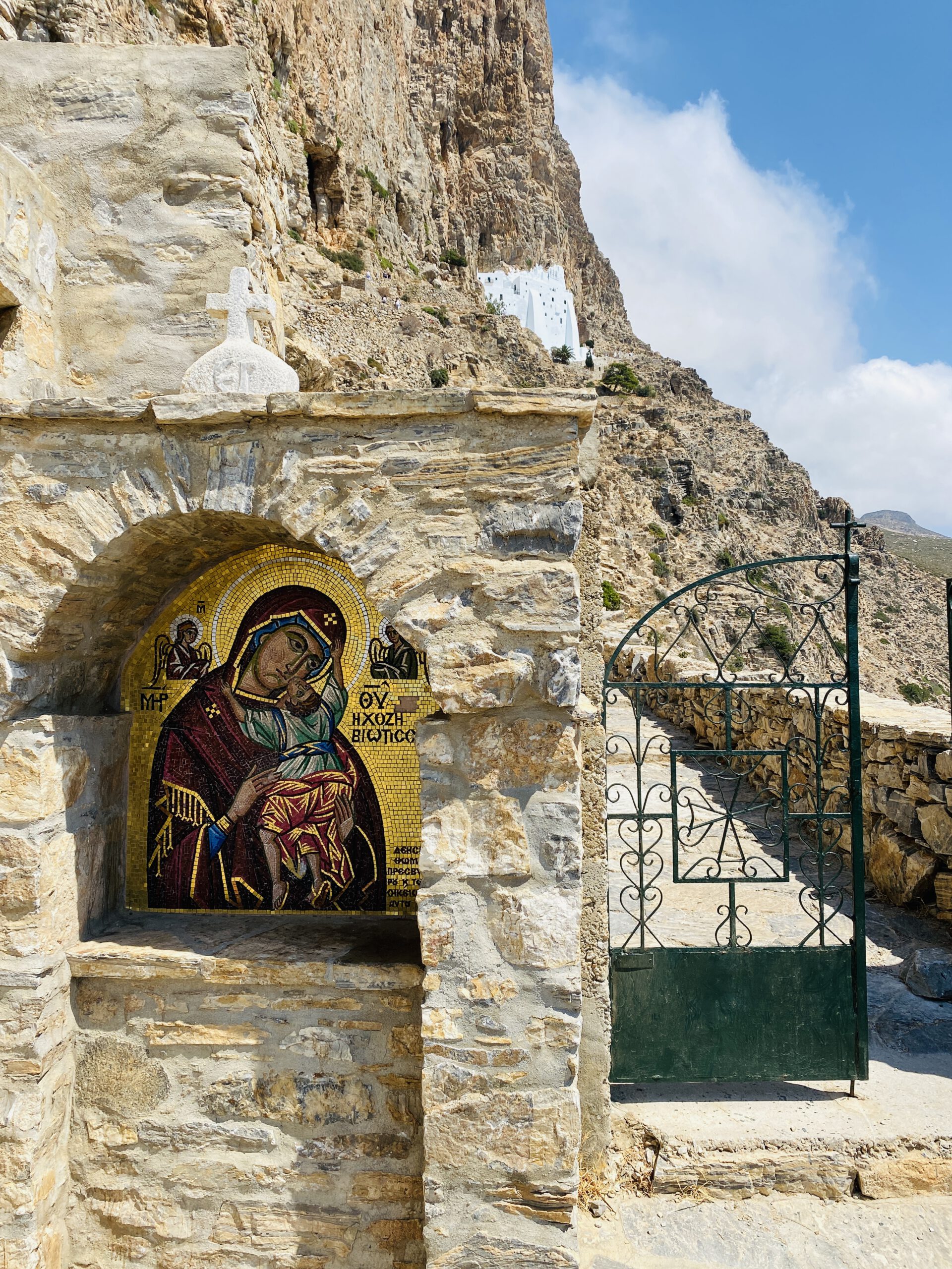 Das berühmte Felsenkloster Panagia Hozoviotissa, das im 9. Jahrhundert 300 Meter oberhalb von Agia Anna im 9. Jahrhundert erbaut wurde, ist einzigartig. Als wir dort nach einem ordentlichen Fußmarsch ankamen, verschlug es uns die Sprache: Ein weißes Kloster hing in einem Felsen. Mönch Christos empfing uns dort mit einigen deutschen Worten. Als wir die Stufen in eine kleine Kapelle erklommen, wurden wir über die Geschichte des Klosters aufgeklärt, das seine Entstehungsgeschichte in einer geteilten Marienstatue fand, die hier einst an der Stelle unterhalb des Klosters aus Palästina angeschwemmt wurde. Am Ende tranken wir noch einen selbst gemachten Raki und genossen den magischen Ort, der so viel Frieden ausstrahlte. Das Kloster besitzt acht Stockwerke und über 100 Zimmer mit einer Breite von 40 Metern und einer Tiefe von 5 Metern.