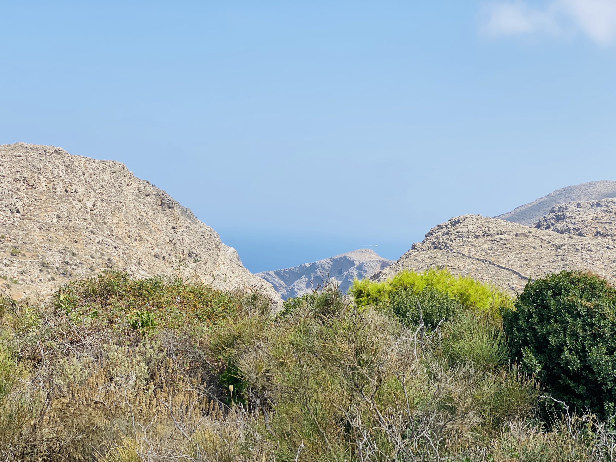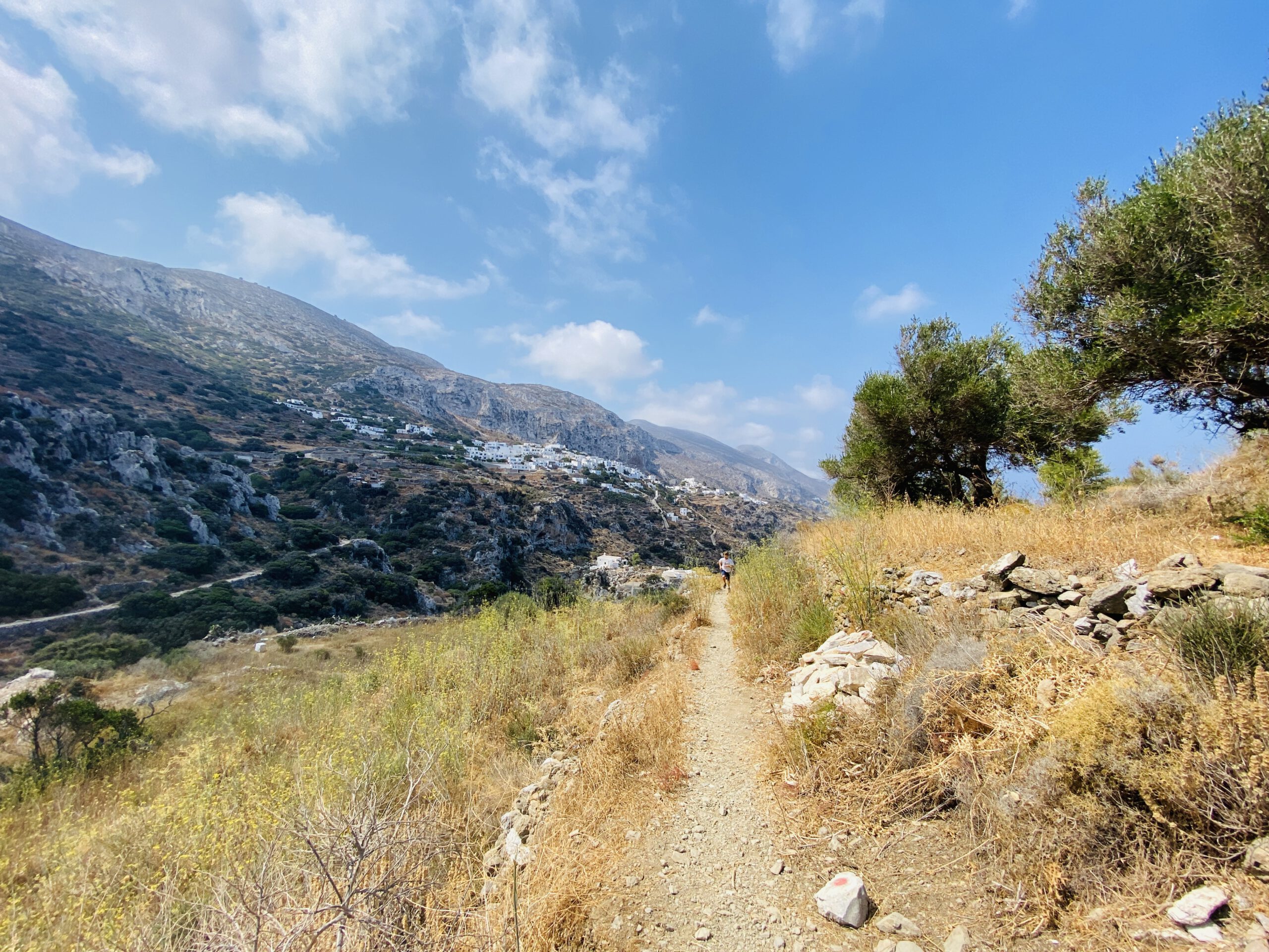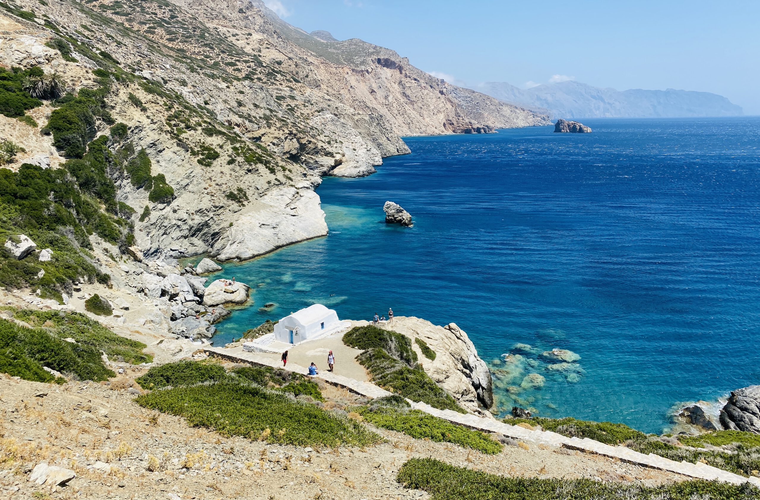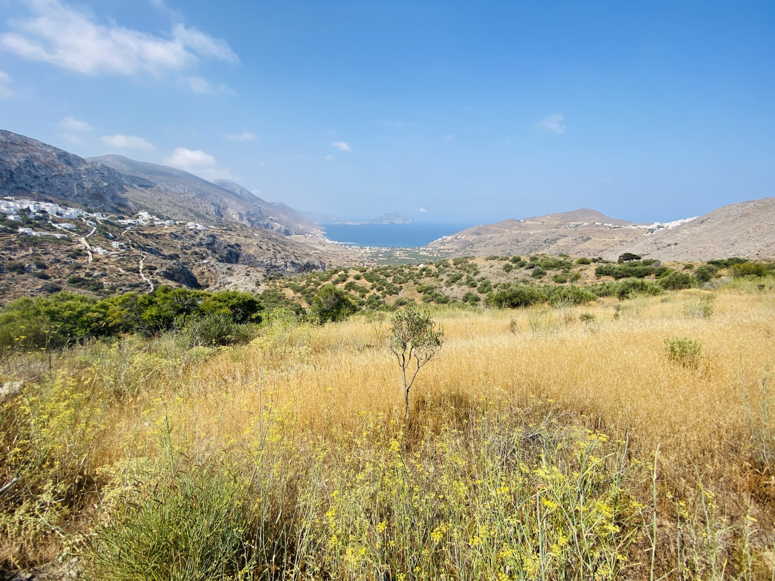 Amorgos ist ein wahres Wanderparadies! Wir hatten früh morgens im August die Drei-Orte-Wanderung in etwa zwei bis drei Stunden unternommen. Vorbei an einer Höhlenkirche und duftenden Feigenbäumen, von denen gelegentlich einige Früchte in unserem Mund landeten, marschierten wir auf einem schmalen Wanderpfad von einem Örtchen zum nächsten. Auch durchquerten die Araklos-Schlucht, die im blumenreichen Frühjahr besonders spektakulär sein soll. Dabei genossen wir von jeder Stelle der Wanderung einen traumhaften Blick auf Berge und Meer.