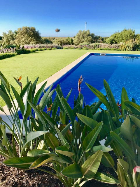 Die Augen unsere Kinder wurden groß, als wir die Einfahrt vom Casa Flor de Sal hinauffuhren. Ein riesiges Storchennest begrüßte uns mit seiner fünfköpfigen Storchenfamilie. Gleich nach dem Aussteigen musste von unseren Kindern alles ausgekundschaftet werden: ein verwunschener Schwimmteich, ein großer Pool, ein Spielplatz und ein Gemüse- und Obstgarten mit dicken Erdbeeren, die es zu ernten gab!