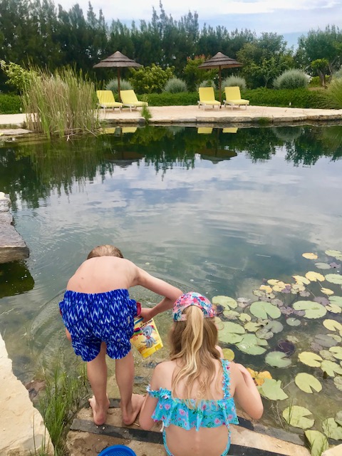 Wer von Euch hat schon einmal im Schwimmteich gebadet? Wir geben zu, wir mussten uns bei unserem ersten Bad im Teich sehr überwinden. Dann war es herrlich, neben Seerosen und Fröschen zu schwimmen. Auch die Ruheplätze am kleinen Beach neben Teich waren gemütlich.Toll waren auch die Pools, einer für Kleinkinder und einer für größere Kinder und Erwachsene, und die Möglichkeit, dort selbstgemixte Smoothies von Martin und Alexandra auszuprobieren. Die Swimmingpools und der Schwimmteich waren umzäunt und durch ein Gartentor abgesperrt, perfekt also für Familien mit kleinen Kindern!