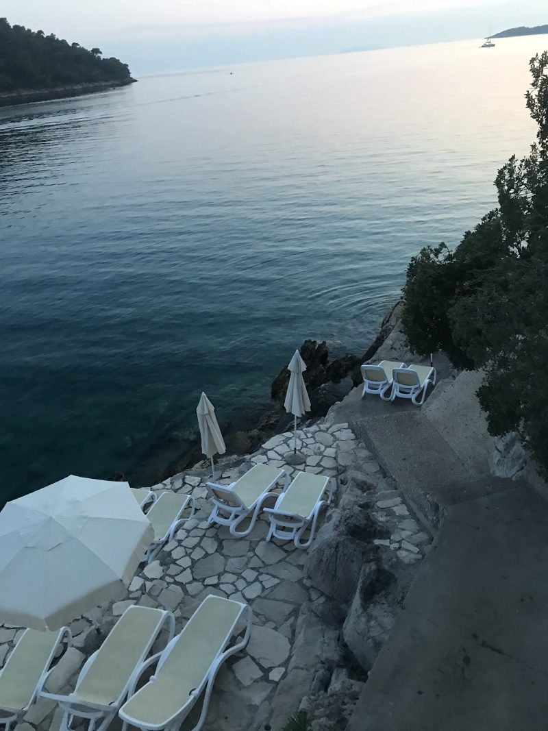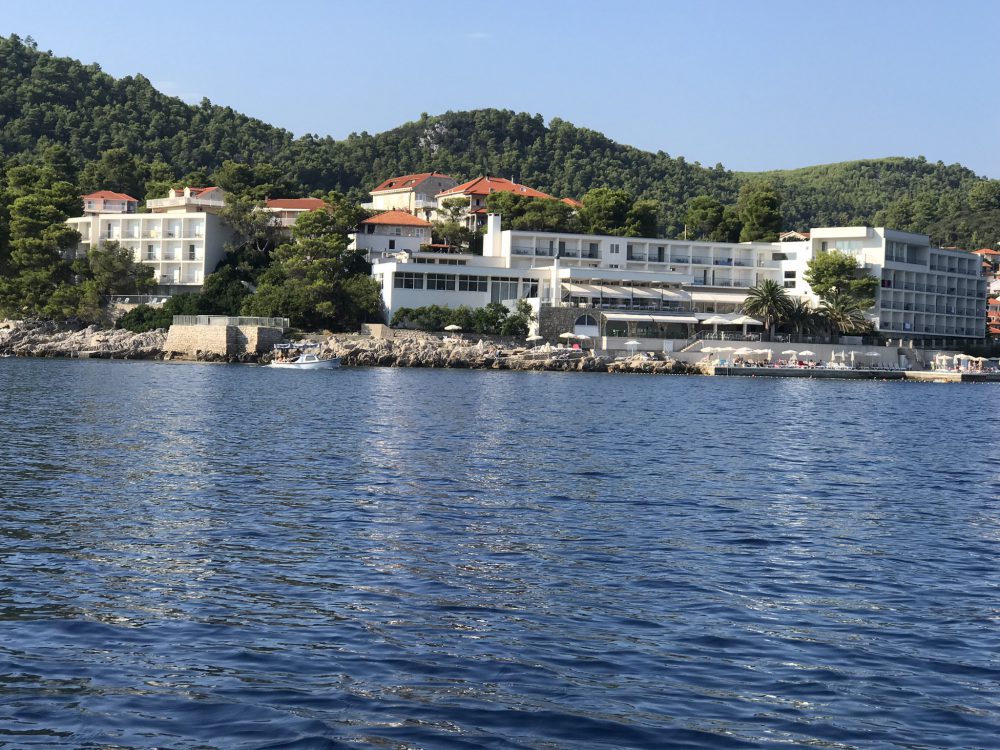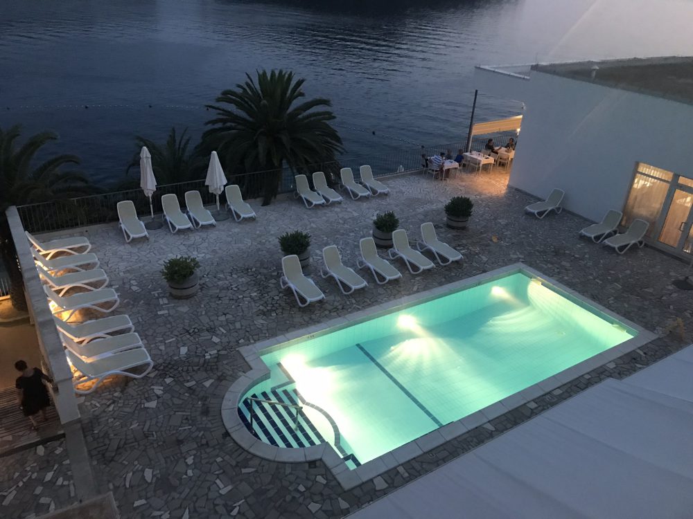 Das Hotel mit rund 80 Zimmern besteht aus einem Haupt- und Nebenhaus. Beide Häuser befinden sich direkt in Hanglange am Meer im Ort Brna. Treppensteigen ist angesagt! Das Frühstück und Abendessen haben wir im Restaurant immer auf der wunderschönen Terrasse mit Meerblick eingenommen. Außerdem gibt es noch einen Mittagssnack- und Barbereich zwischen den Meerterrassen und dem Swimmingpool. Dort konnte man abends auch a la Carte essen und nach dem Abendessen einen Drink nehmen. Schön waren auch die Live Band-Abende mit einer Extra-Bühne und weißen Bartischen vor der Bucht Brnas, die sehr stimmungsvoll waren.