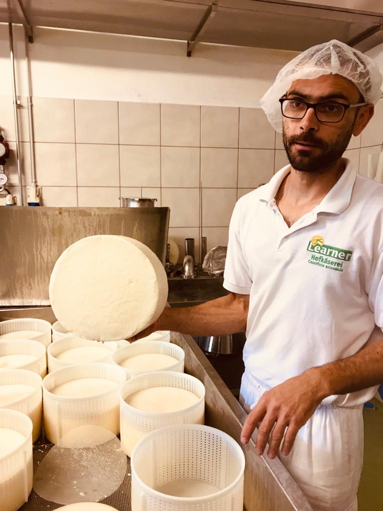 Die Hofkäserei Laerner mit dem Lehrnerhof liegt in Deutschnofen, inmitten von saftigen Wiesen, im Hintergrund thront das Rosengartenmassiv. Der Lehrnerhof besitzt hauseigene Kühe für die Milch- und somit Käseproduktion.