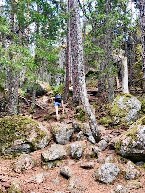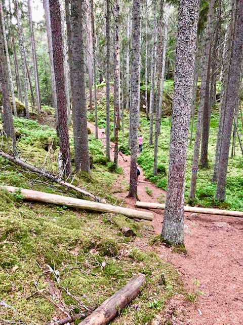 Der Nationalpark gleicht einem skandinavischen Dschungel mit Kiefern, Fichten, Birken, Heidelbeersträuchen, Moosen mit Felsen und Schluchten. Eigentlich hatten wir uns so den Mattiswald von Ronja Räubertochter vorgestellt. Gleich am Eingang des Nationalparks erhielten wir eine Wanderkarte und den Hinweis, dass wir uns mit reichlich Wasser ausstatten sollten. Der Eintritt in den Park war umsonst. Wir entschieden uns für eine 3,5 stündige Wanderung, die sehr gut markiert war und „im wahrsten Sinne des Wortes“ über Stock und Stein führte. Wir waren froh, dass unsere Kinder und wir geländegängige Wanderwege kannten und sehr viel Spaß hatten, auf Trollfelsen und über Baumstämme zu klettern. Bei einem näheren Studium der Wanderkarte stellten wir fest, dass es aber auch durchaus weniger steile, einfachere und kürzere Wanderungen für jede Kondition gab.