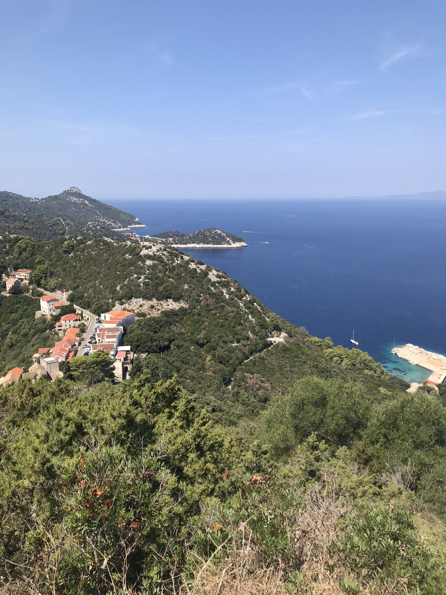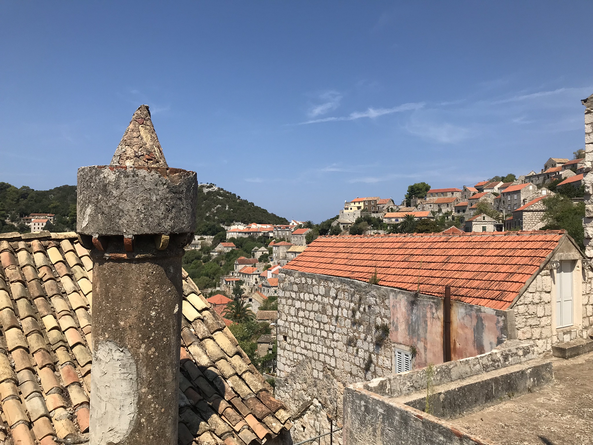 Von Brna aus hatten wir am letzten Tag einen organisierten Bootsausflug nach Lastovo unternommen. Der schönste Ausflug in unserem Familienurlaub auf Korcula in Kroatien. Lastovo befindet sich zehn Kilometer von Brna entfernt und ist ein absolutes Naturparadies. Außer ein paar Dörfern findet man hier ausschließlich unberührte Natur. Lastovo ist ein unter Schutz stehender Naturpark, der sich auf der Liste der zehn Paradiesgärten im Mittelmeer befindet. Unser erster Stopp war das Dörfchen Lastovo. Schon im kleinen Hafenbecken fiel uns auf, dass das Wasser kristallklar war und nahmen dort unser erstes Bad. Danach stiegen wir ungefähr zehn Minuten den Berg in das Dörfchen Lastovo hinauf und erkundeten es, das neben seiner Ursprünglichkeit und Authentizität auch für seine Schornsteine bekannt ist. Sie zeichnen sich nämlich durch ihre Höhe und zylindrische Form aus. Sie mussten früher sehr hoch sein, damit der Wind den Rauch nicht wieder ins Haus „drückte“. Mittlerweile sind sie ein Statussymbol vieler Familien – je größer und schöner, desto höher ist der Status einer Familie. Eine weitere Besonderheit von Lastovo war bzw. ist der dunkle Nachthimmel. Fast nirgendwo in Europa ist es so dunkel wie in Lastovo, da es keine störenden Lichter gibt. So kann man die Milchstraße mit bloßem Auge erkennen.