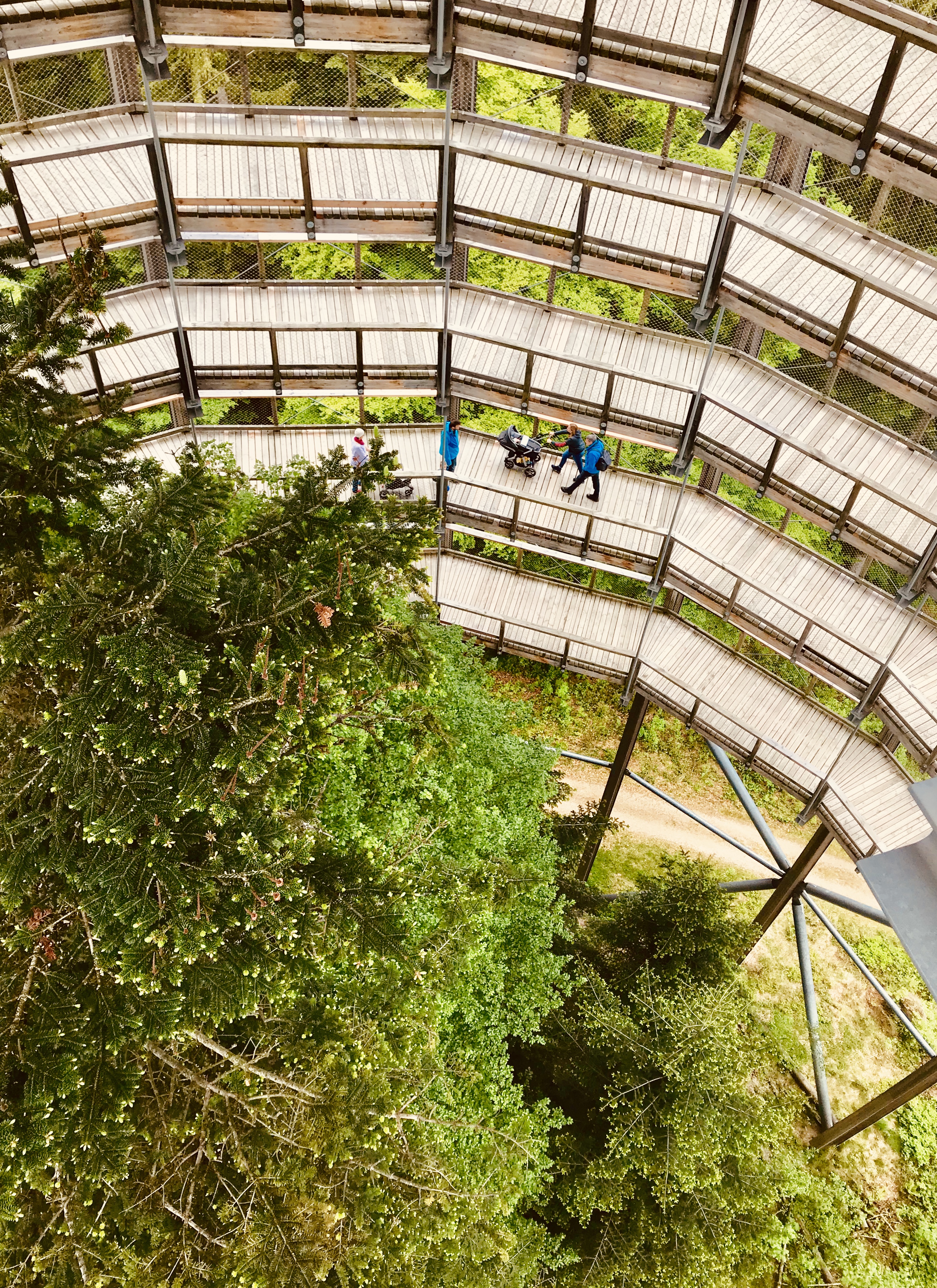 Der Baumwipfelpfad im Bayerischen Wald ist der erste Baumwipfelpfad, den wir jemals begangen sind – es war unbeschreiblich! Wir erlebten den Wald aus einer anderen Perspektive und schwebten wie Vögel über die Baumwipfel! Wir konnten uns gar nicht satt sehen an den unterschiedlichen Grüntönen der Bäume. Der Pfad ist bis zu 25 Meter hoch! Die Krönung des Pfades war das Baumwipfelei, in dem wir uns auf ganze 44 Meter spiralförmig hoch schraubten und eine fantastische Aussicht auf den Nationalpark genossen. Das Baumwipfelei ist eigentlich ein Turm mit Aussichtsplattform in Eiform.