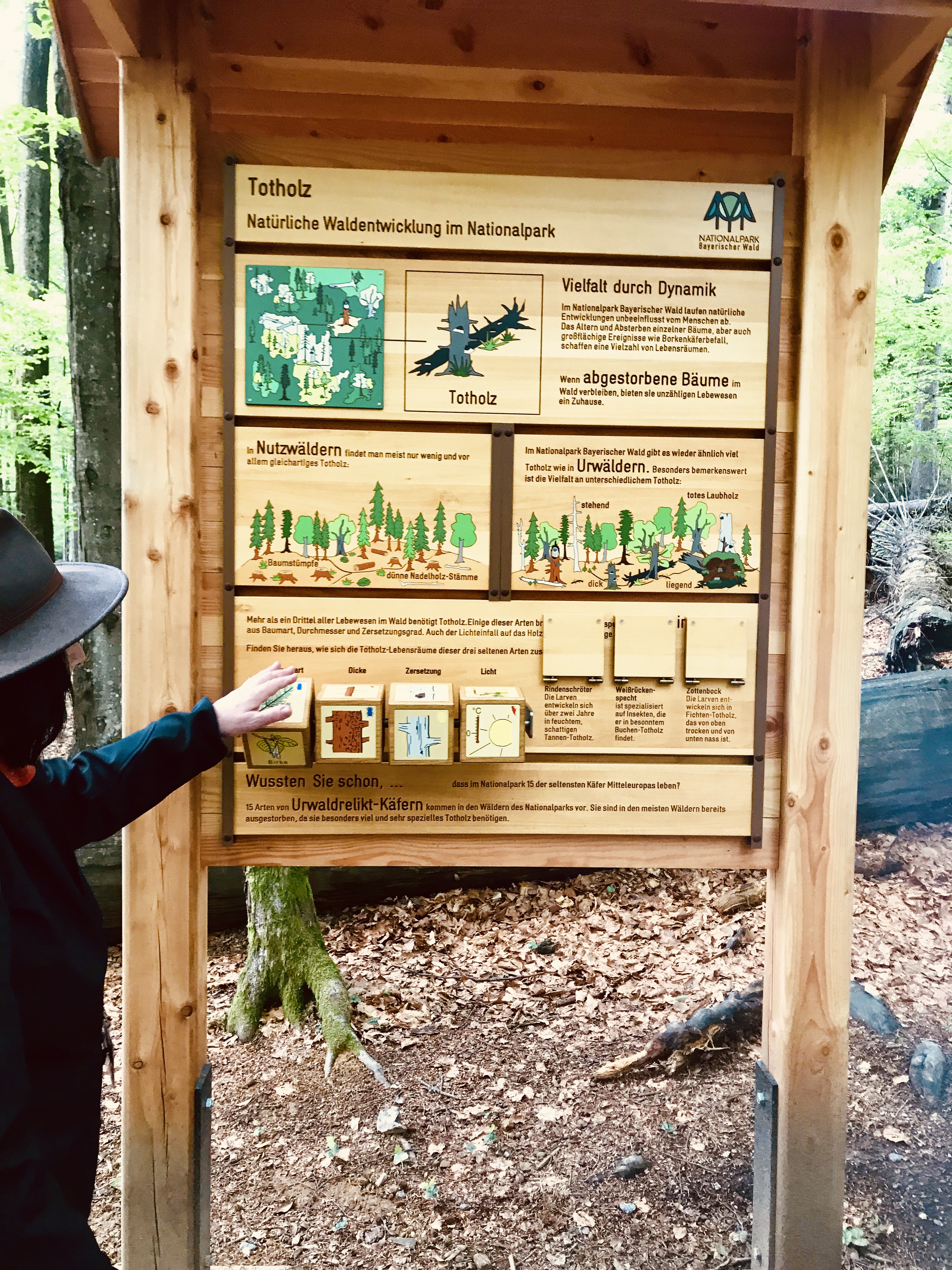 Bevor wir in den Nationalpark starteten, machten wir erst im Hans-Eisenmann-Haus am Lusen halt, um uns näher über den Park zu informieren. Das Informationszentrum ist nach Hans Eisenmann benannt, der in den 70er Jahren Staatsminister für Landwirtschaft und Forsten war und sich sehr für die Renaturierung des Bayerischen Walds und für den Nationalpark als Naturschutzzone einsetzte. Das Informationszentrum beherbergt eine informative und interaktive Dauerausstellung „Wege in die Natur – Eine Geschichte von Wald und Menschen“. Sie klärt auf, was hinter der Philosophie „Natur Natur sein lassen“ steckt und wie sich das Schutzgebiet seit seiner Gründung weiterentwickelt hat. Wir lernten, welche heimischen Pflanzen und Tiere im Nationalpark angesiedelt sind bzw. leben – für die Kinder war alles interaktiv und spielerisch an elf Hörstationen aufbereitet. Sehr sehenswert! Auch erzählte uns Waldführerin Marianne viel über die Anfänge des Nationalparks und die Widerstände gegen einen Wald, der nicht geforstet und daher „unordentlich“ aussieht.