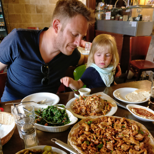 In Gaststätten und Cafés werden Kinder mit offenen Armen empfangen: sie haben immer Kindersitze oder Sitzauflagen, die große Auswahl an Mezze, mediterane Vorspeisen, die mitten auf den Tisch gestellt werden und sich jeder frei bedienen kann, macht es einfach, die Mahlzeiten zu teilen. Ja, es wird auch mit den Fingern gegessen, was es uns Eltern auch manchmal einfacher gemacht hat: ein Stück Pita Brot links und eine Schale vom köstlichen Hummus rechts und die Kinder (und wir!) waren glücklich.