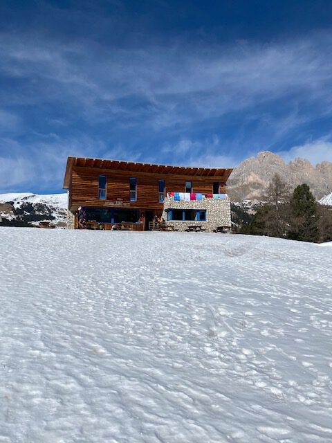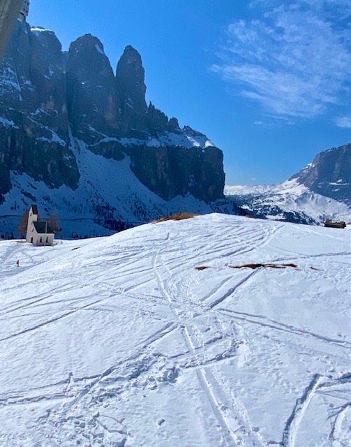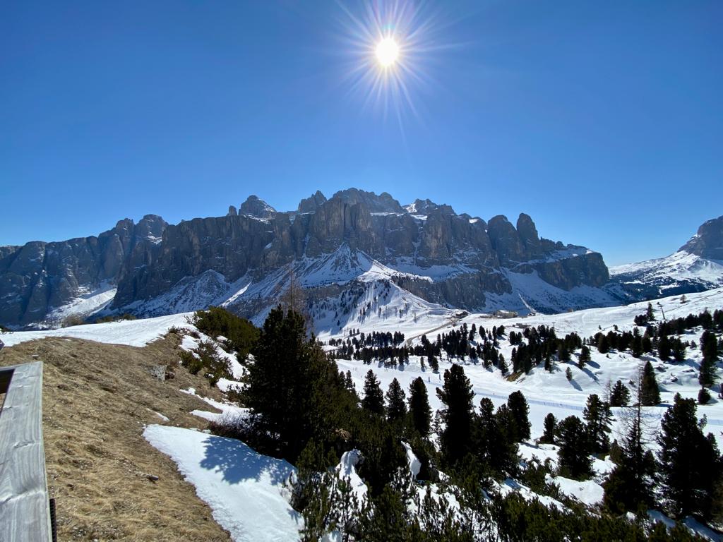 Das Skigebiet von Santa Christina, Wolkenstein und Col Raiser ist wirklich riesig. So schwangen wir uns auf kilometerlangen Pisten mit atemberaubenden Aussichten die Dolomitenberge hinab – bei bestens präparierten Pisten und Schnee. Besonders überzeugte uns das Col-Raiser-/Seceda/Fermeda/Cuca-Skigebiet mit quasi leeren Pisten und wunderschönen alten Almhütten mit traditionell Grödener Spezialitäten wie der Malga Neidia Hütte. Einen sensationellen Blick auf den Langkofel hatten wir von der Troier Hütte auf der Seceda-Alm, auf der wir uns noch stundenlang sonnten. Ebenso schön waren die Abfahrten Dantercepies in Wolkenstein und die chillige Jimmi Hütte auf dem Grödenerjoch. Während wir ein traditionelles Marendebrettl genossen, gönnten sich unsere Nachbarn ein Gourmet-Steak.
