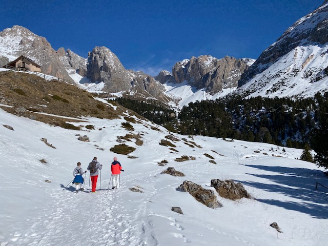 Die aussichtsreiche Winterwanderung (3-4 Stunden) startet an der Bergstation der Col Raiser-Bahn. Von dort wanderten wir mit Ausblick auf die Geislerspitzen zur Regensburgerhütte (im Winter geschlossen) und schließlich weiter durch ein Wäldchen zur Juac Hütte. Die Juac Hütte ist ganzjährig geöffnet und bietet einen herrlichen Blick auf die umliegenden Berge.