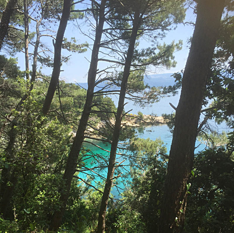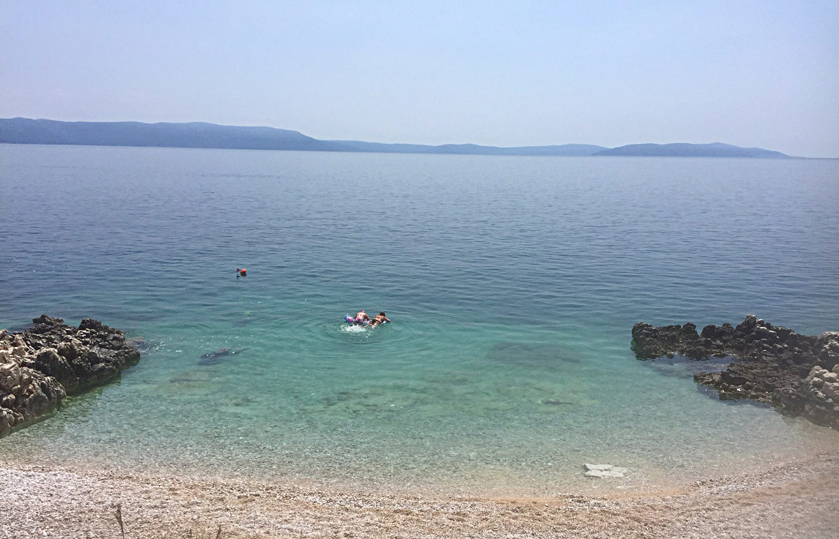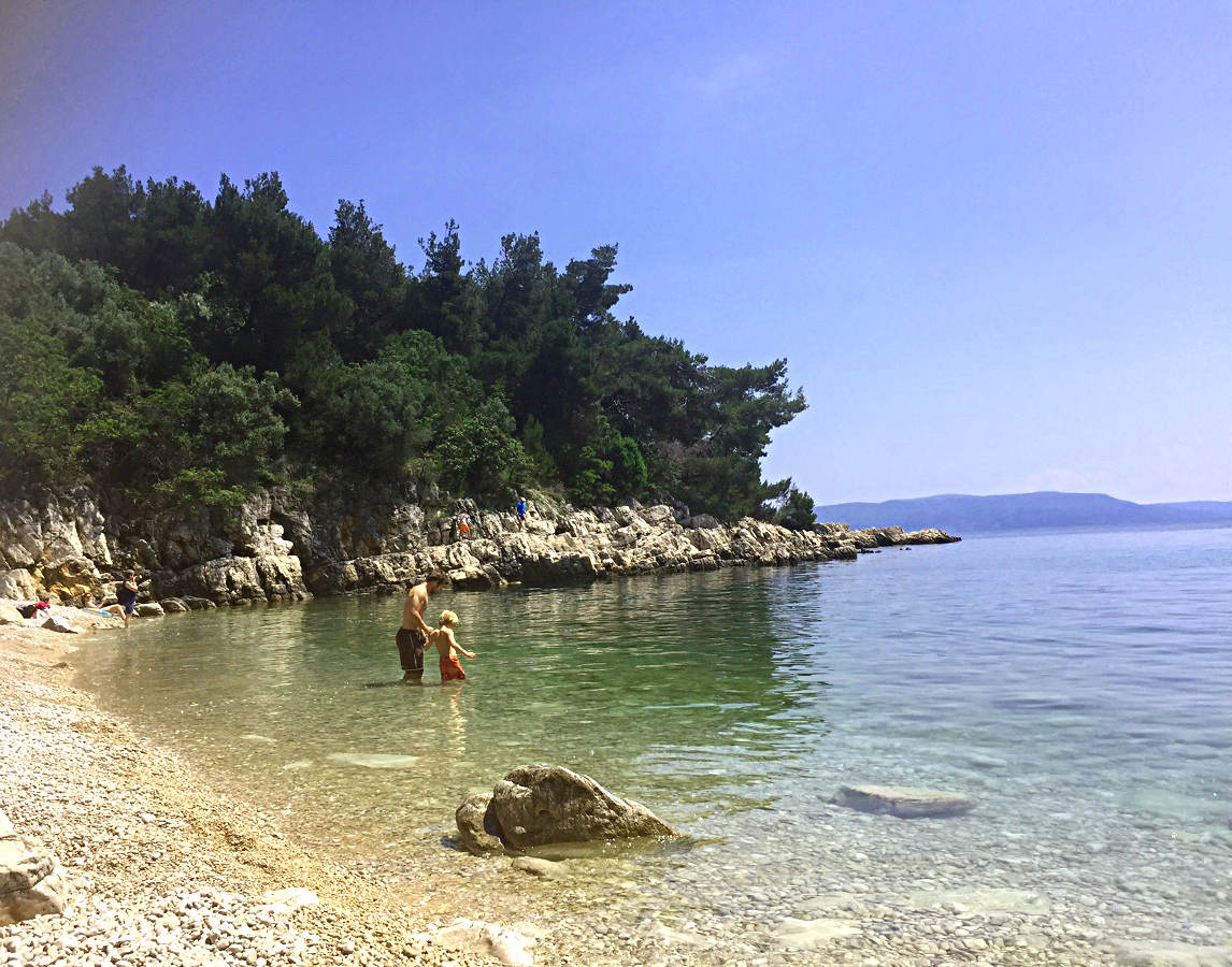 Der nächste Strand von unserem Haus waren der von Rabac. Rabacs´ Hauptstrand hat uns ehrlicherweise nicht gefallen: mit großen Hotelbunkern, Souvenirshops und Restaurants bebaut, ist hier die Hölle los. Etwas nördlich des Ortsstrandes, unterhalb des Hotelkomplexes Hotel Valamar Bellevue wird es jedoch viel ruhiger. Von hier aus kann man wunderbar entlang eines aussichtsreichen Uferweges zwischen den vielen kleinen Badebuchten wählen, die sich rechterhand auftun. Aber Achtung, manche sind für Hunde geöffnet, andere reine FKK Buchten- man muss also ein wenig suchen, bis man den geeigneten Strand findet. Eine Landkarte unterhalb des Tennisplatzes, wo sich entlang der Straße auch zahlreiche kostenpflichtige Parkplätze befinden, zeigt Euch den Weg. Ziel ist nach ca. zwei Kilometern eine kleine versteckte Bucht, zu der man aber den Kinderwagen einige Stufen hinunter tragen muss. Aber es lohnt sich, die Badebucht ist herrlich (jedoch ohne Infrastruktur) und als Rückweg bietet sich die Rundtour oberhalb des Küstenweges durch den mediterranen Wald an.