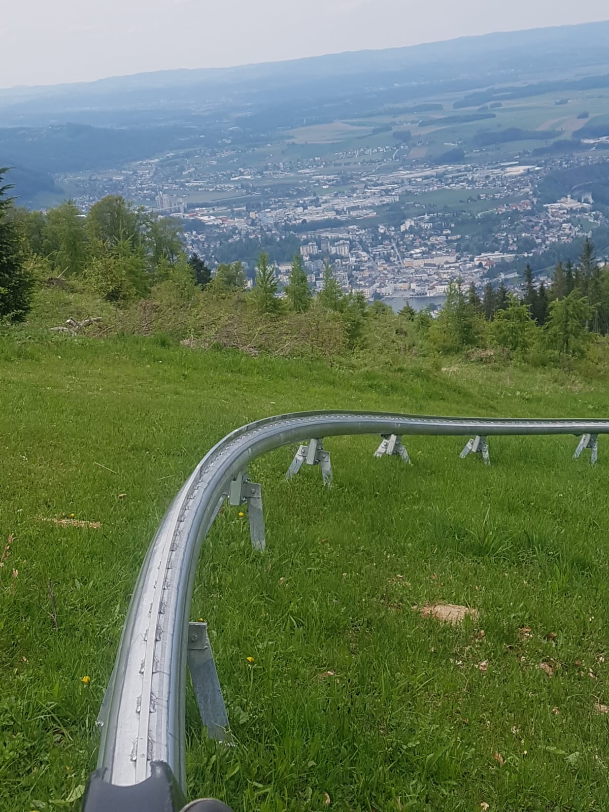 Am Grünberg selbst sausten wir auf der Sommerrodelbahn 1,4 km hinab ins Tal – zum größten Vergnügen der Kinder, die gar nicht genug davon bekamen. Hochgezogen auf den Grünberg wurden wir mit einem Lift. Ab sieben Jahren dürfen die Kinder übrigens allein rodeln.