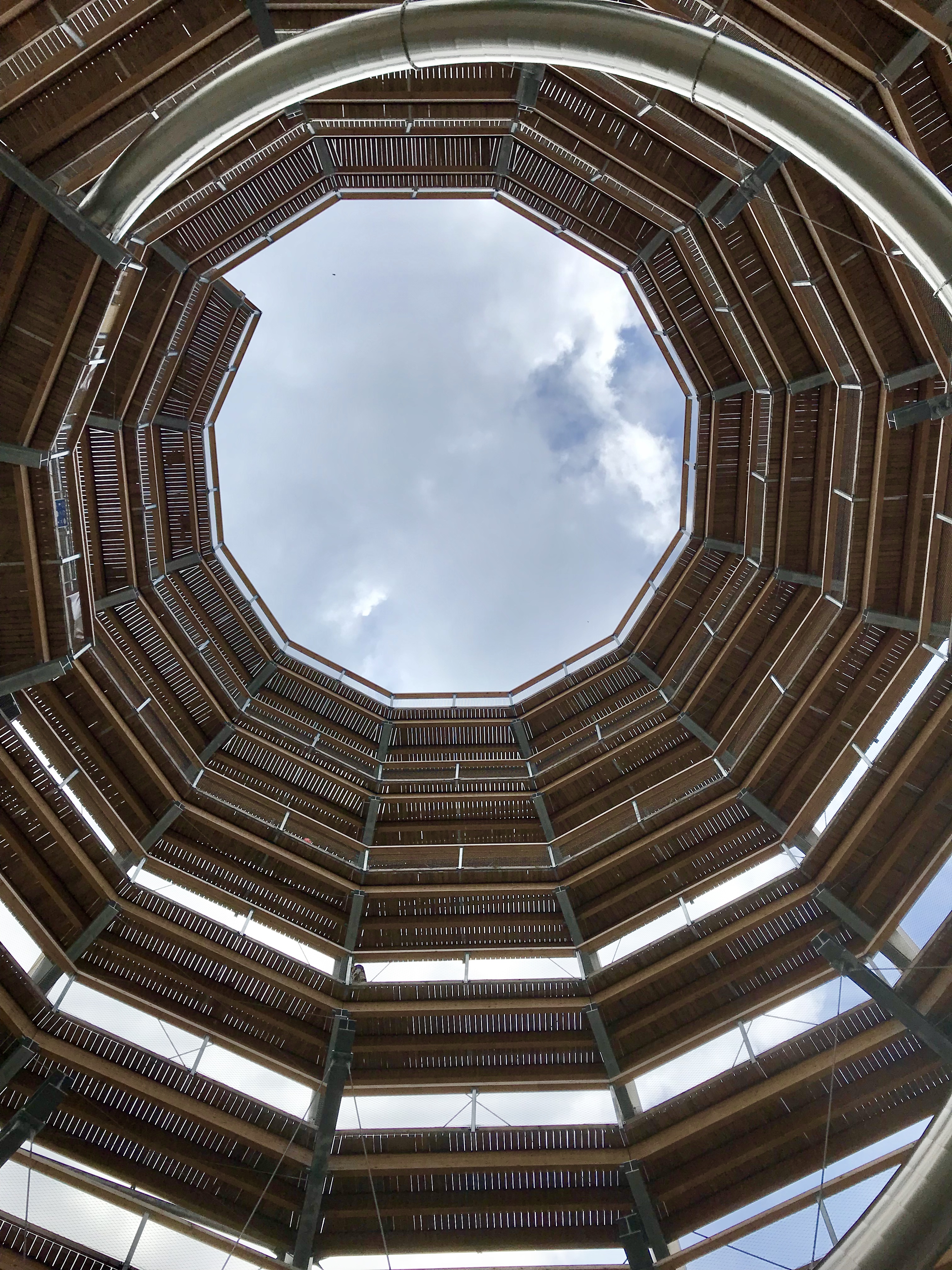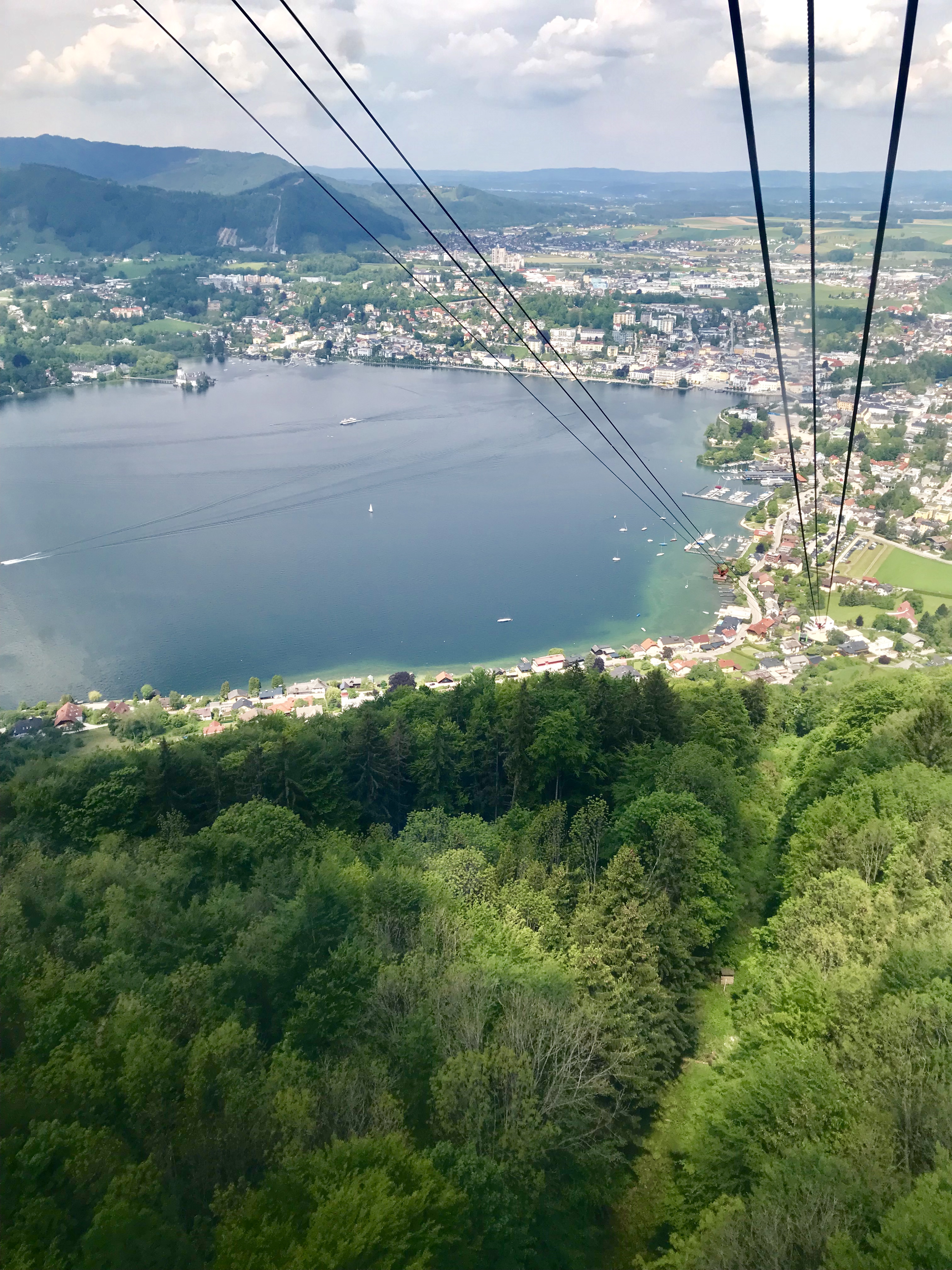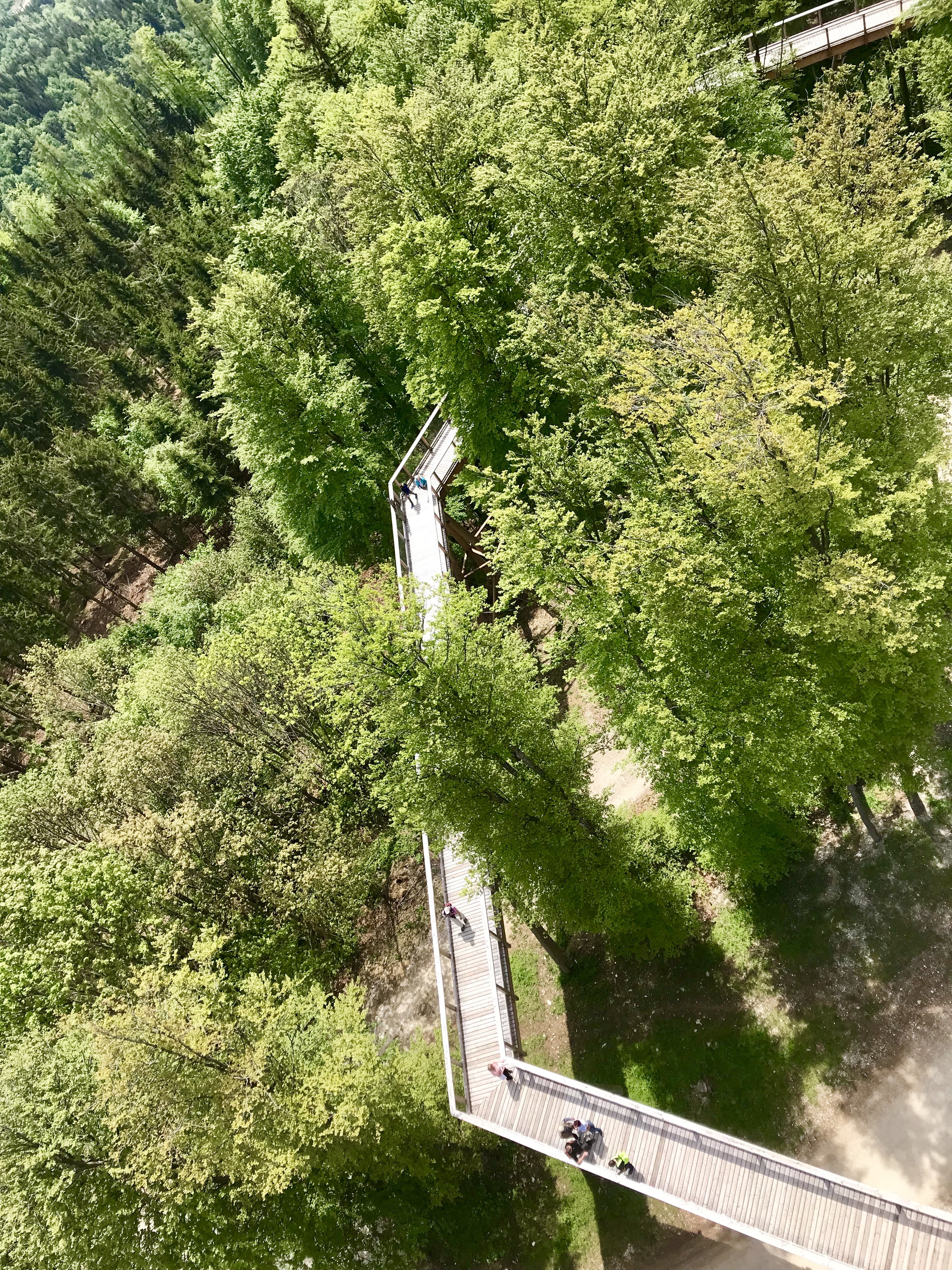 Als wir den Kindern erzählten, dass wir auf einen Berg fahren, war die Stimmung auf dem Tiefpunkt. Als wir ihnen aber erzählten, dass wir nicht wandern gehen, sondern auf einem Berg-Baumwipfelpad laufen, waren sie nicht mehr zu bremsen. Es ging mit der Seilbahn hinauf auf den 1000 Meter hohen Grünberg und dann ein paar Gehminuten weiter zum Baumwipfelpfad „Salzkammergut“. Wir haben von dort so viele Bilder geschossen wie noch nie! Auch schwebten wir über See und den Bäumen und waren den Bergen so nah wie noch nie. Am Ende des Pfades schraubten wir uns einen Zylinder hoch und genossen ein weiteres Mal die Aussicht. Auch kamen uns viele Familien mit Kinderwagen entgegen, die problemlos zur Aussichtsplattform gelangten.