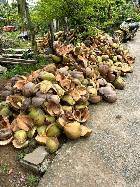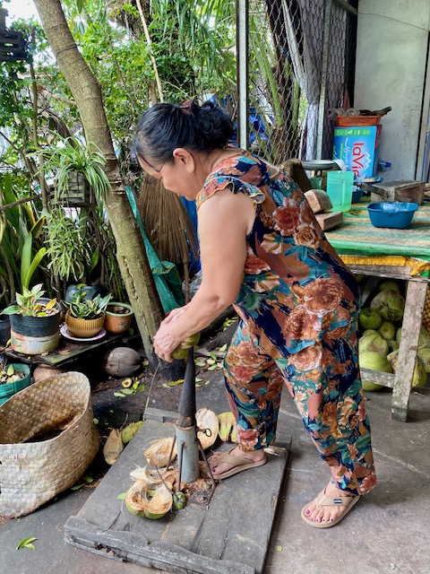 Weiter ging es ins nächste Dorf, vorbei an Hühnern, Hunden, Katzen, in Hängematten liegenden Vietnamesen, spielenden Kindern und wunderschönen Obstgärten mit Guaven, Tamarinden, Mangos und Pomelos zu einer Kokosnuss-Bonbon-Macherin. Hier wurde uns, auf ganz traditionelle Weise, gezeigt, wie Kokosnuss-Bonbons aus Malz und Kokos hergestellt werden. Auch hier durften wir selbstverständlich probieren – und höflich aufgefordert, etwas zu kaufen…