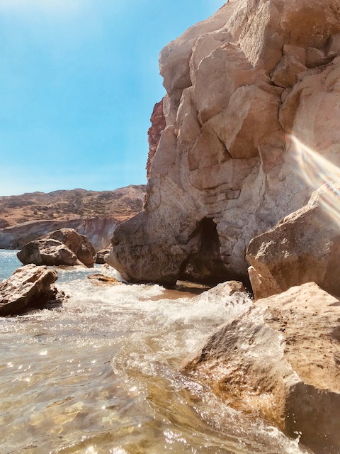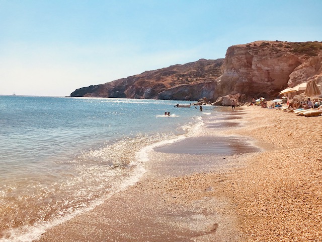 Am Strand von Paliochori wurde uns bewusst, dass Milos immer noch geothermisch aktiv ist. Schon bei der Ankunft am Strand Paliochori fielen uns seine roten Felswände auf. Als wir dann später schnorchelten, entdeckten wir die zahlreichen Gasbläschen, die vom Meeresgrund empor stiegen und schwefelhaltige Thermalquellen, die unter Wasser austraten. Schnorcheln war hier überhaupt der Hit, denn wir konnten zahlreiche bunte Fische sehen.