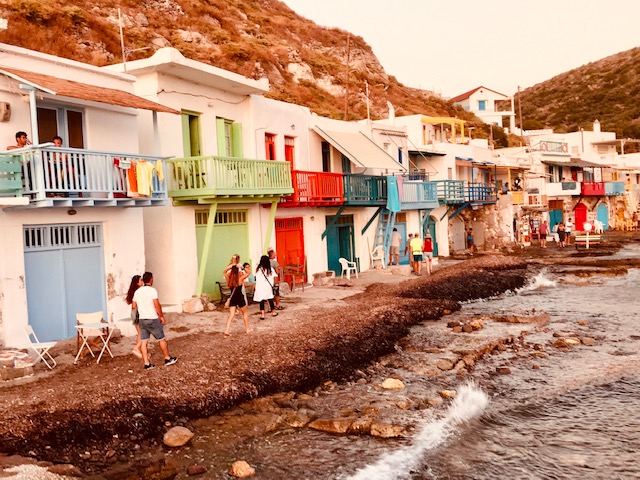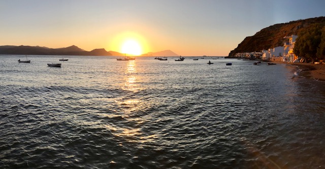 Das süße Örtchen Klima ist ein wunderschönes und ursprüngliches Fischerdorf, dessen schiefe und krumme Fischerhäuschen in bunten Farben erstrahlen. Wir hatten direkt oberhalb des Ortes im Hotel Panorama gewohnt. Auch gibt es einen schönen Wanderweg von Tripiti über die Katakomben und den Fundort der Venus von Milos nach Klima. Hier ist der Sonnenuntergang sehr malerisch, denn die Sonne geht im Meer vor runden Felsen unter. Wir hatten einen Tisch im Restaurant Astakas direkt am Meer reserviert und genossen den Blick und hervorragendes Essen. Wir waren schon eine halbe Stunde vor Sonnenuntergang da, um Fotos zu machen und die ursprüngliche Atmosphäre des Örtchens aufzufangen. Zwar waren schon einige Touristen hat, das Örtchen wirkte aber immer noch sehr untouristisch.