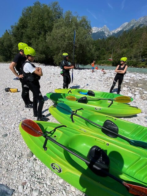 Großen Spaß hatten wir mit Adrian von Alpin Adventures auf einer Kajak-Sit-On-Kajaktour auf der Panoramastrecke der Soča. Mit ein paar Tricks & Tipps – wie man Paddel & Gewicht korrekt einsetzt, einen Fluss traversiert oder richtig Kurven fährt – ging das Kajak fahren nach drei Stunden und gelernter Technik viel besser! Trotzdem war der Nervenkitzel – neben Adrian, der wie ein Fels in der Brandung war – ständiger Begleiter bei Stromschnellen und herausfordernde Strömungen! Nebenbei konnten wir das herrliche Panorama des Tals genießen, denn es ging vorbei am Boka-Wasserfall, dem Kanin-Berg und dem Triglav, dem höchsten Berg Slowenien.