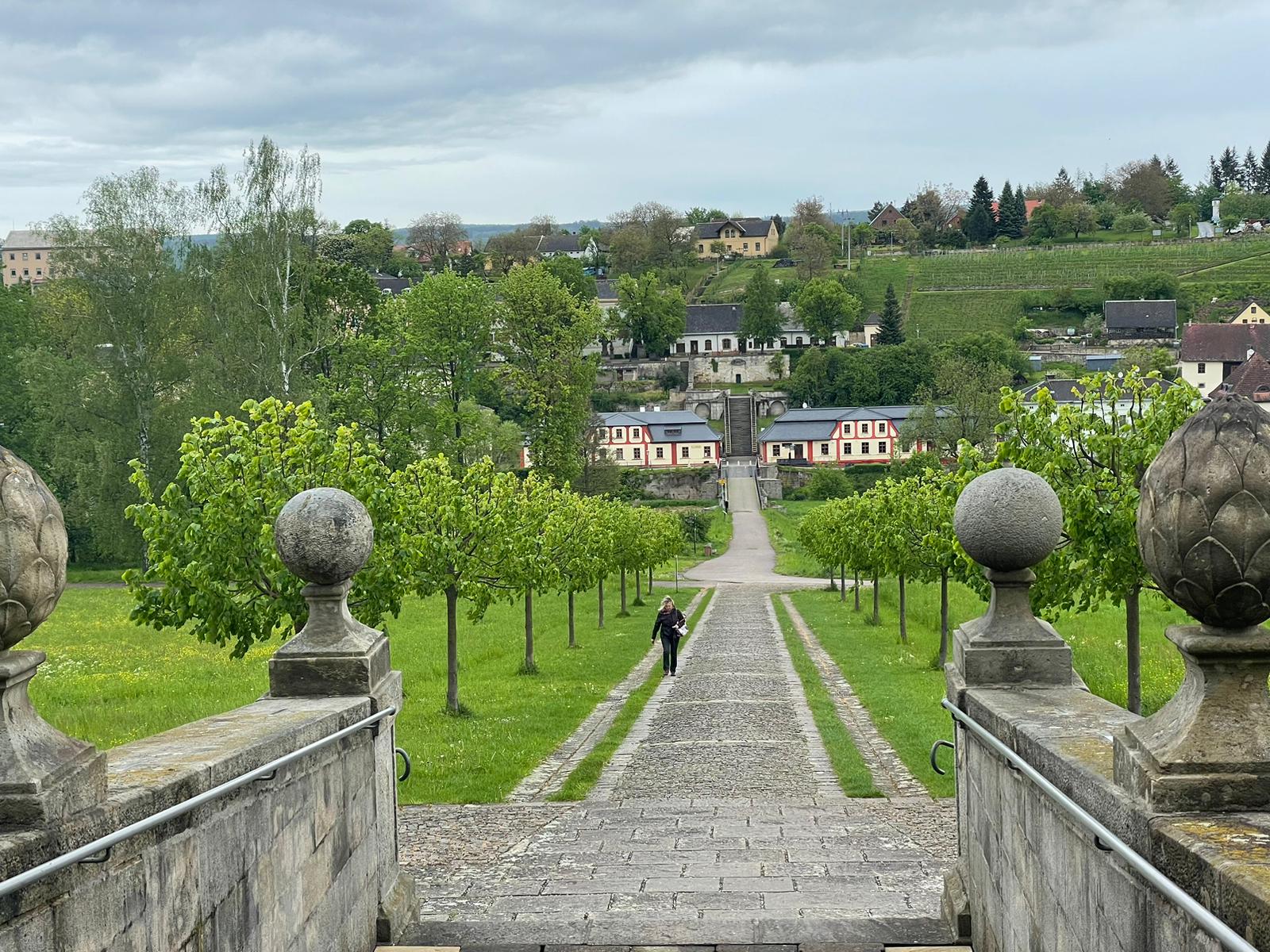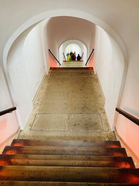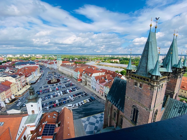 Königgrätz, Hradec Kralové, ist dafür bekannt, dass hier die berühmte Schlacht von 1866 als Entscheidungsschlacht im Preußisch-Österreichischen Krieg stattfand, aber auch dafür, dass in dem Städtchen Elbe und Adler zusammenfließen. Direkt neben der Kathedrale reihen sich hübsche, bunte Häuser aneinander. Gleich daneben thront der berühmte weiße Turm, Bílá věž, der ursprünglich ein Wachturm war und Tschechiens zweitgrößte Glocke, die Augustin, besitzt. Sie wird zu besonderen Anlässen geläutet, wie etwa zu Weihnachten. Von der 72 Meter hohen Aussichtsplattform hatten wir einen tollen Blick über die Stadt und Umgebung, den wir – genauso wie den Aufstieg durch das pink-rot-leuchtende Treppenhaus, genossen. In den Arkaden auf dem Kathedralenplatz fanden wir in einem der zahlreichen Cafés und Restaurants einen Platz, um tschechische Cola „Kofola“ und einen tschechischen Kaffee „Káva“. Zurück gingen wir über die singende Treppe und freuten uns über klassische Musik beim Hinabsteigen der Stufen.