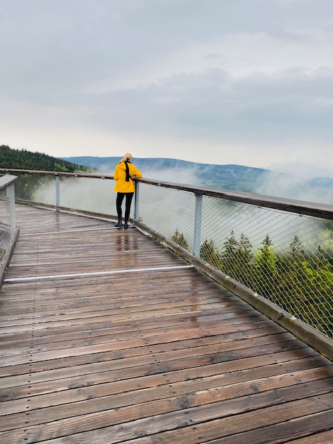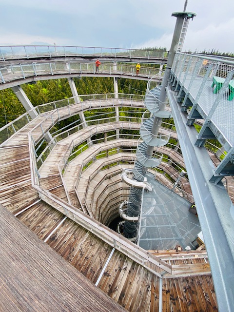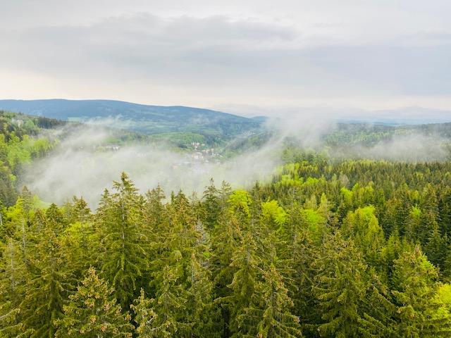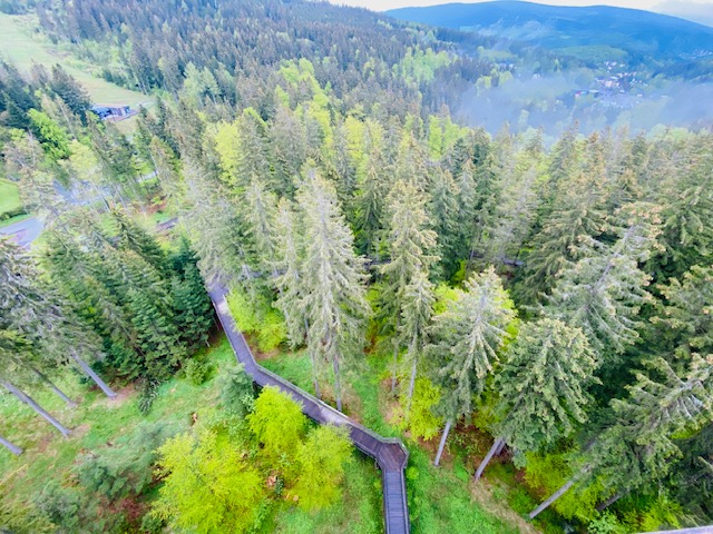 Johannisbad „Janské Lázně“ ist ein Kurort im Riesengebirge. Er hat sich auf Behandlung von Problemen im Bewegungsapparats spezialisiert und besitzt eine eigene Thermalquelle. Das Hotel Vyhlídka hat einen wunderbaren Spa und unheimliches gutes Essen. Sehr zu empfehlen ist das Boeuf Bourgignon und die Minz-Erbsensuppe. Aber nicht nur deswegen kommen hier scharenweise Touristen her, denn Johannisbad ist auch ein beliebter Skiort im Riesengebirge. Uns waren im Ort sofort die imposanten Kolonnaden aufgefallen, eine Jugendstil-Halle geschmückt mit Palmen, in der regelmäßig Veranstaltungen stattfinden. Außerhalb vom Ort befindet sich der Baumwipfelpfad „Stezka korunami stromů Krkonoše“mit seinem 45,5 Meter hohen Aussichtsturm in Form eines Enzians, auf den wir uns hinauf gezwirbelt hatten. Oben angekommen hieß es erst einmal ‚tief durchatmen‘ und Waldenergie tanken. Lasst Euch die goldene Stunde nicht entgehen, wenn die Sonne langsam im Horizont untergeht. Manchmal könnt Ihr auch den sanften Tönen einer Violine lauschen und nebenbei Champagner schlürfen. Eine traumhafte Abendstimmung!