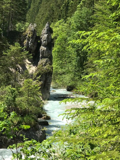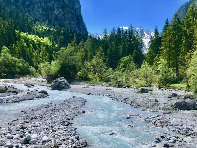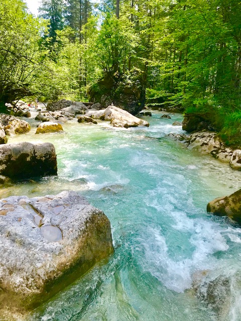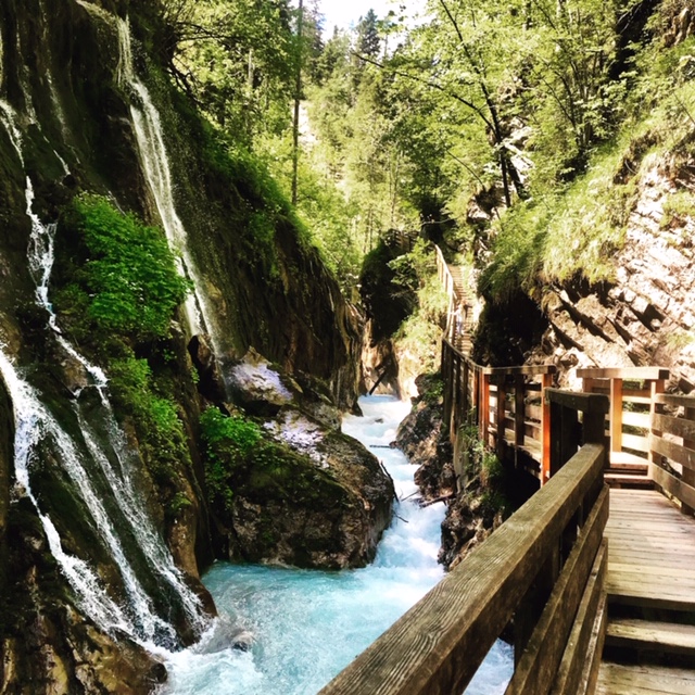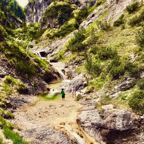 Die Wimbachklamm und das Wimbachtal sind landschaftlich spektakulär: die Klamm mit türkisblauen Wasser und das enge Tal, das von den Gipfeln Watzmann & Co umgeben wird. Am besten startet Ihr die Wanderung vom Wanderparkplatz an der Wimbachbrücke/Wimbachklamm aus. Die Wimbachklamm ist eine der Hauptattraktionen im Berchtesgadener Land und deshalb schwer zu verfehlen. Hier dürft Ihr Euch von den zahlreichen Touristen nicht abschrecken lassen. Die meisten wandern nur durch die Klamm und kehren dann wieder um. In der Klamm angekommen, offenbart sich ein wildromantisches Spektakel: ein rauschender Fluss mit türkisblauem Wasser. Überall stürzen kleine Bäche in die Klamm. Ihr selber lauft auf kleinen, engen Stegen. Die Begehung der Klamm dauert nur rund 15 Minuten, dann ist der absolut lohnenswerte Zauber vorbei! Direkt hinter der Klamm beginnt das Wimbachtal. Ihr lauft entlang eines großen breiten Flussbettes und Euch eröffnet sich eine imposante Berglandschaft. Die dolomitenartigen Berge Watzmann und Hochkalter begleiten Euch die ganze Zeit durch das Tal. Die Wanderung durch das Tal bis zum Wimbachschloss, einem netten Gasthof und dauert rund eine Stunde. Zurück geht es auf demselben Weg. Die Wanderung hat keine große Steigung, dauert hin und zurück rund drei Stunden ohne Einkehr und ist mit dem Kinderwagen machbar).