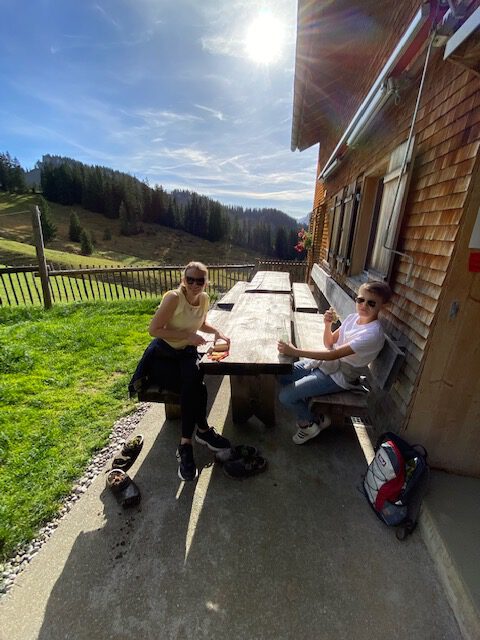 Wir fahren mit der Seilbahn in Bezau zur Mittelstation im Dorf Sonderdach. Von dort folgen wir dem leicht ansteigenden Wanderweg vorbei an Wiesen und durch Wäldchen zu den Wildmoosalpen. Auf den Almen kaufen wir noch an einer Selbstbedienungsstation ein paar Leckereien wie selbst gemachten Almkäse, Landjäger und Hüttenbrot für unseren Picknick-Stopp am nächsten Aussichtspunkt. Anschließend wandern wir weiter Richtung Bergstation Baumgarten. Oben angekommen, folgen wir dem ausgeschilderten Panoramaweg. Er belohnt uns mit dem schönsten Ausblick auf den Bregenzerwald, den Bodensee, das Rheintal und die umliegenden Berge. Nach zahlreichen Fotos geht es mit der Seilbahn wieder zurück ins Tal. Für diese Tour benötigen wir gut drei Stunden.