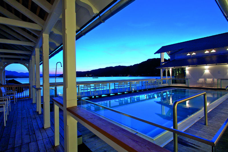 Wir haben mittlerweile viele Spas gesehen und finden das Werzer’s Badehaus außergewöhnlich, ja sogar einzigartig. Es besteht aus einem aufwendig renovierten Badehaus im Wörthersee-Stil, umgeben von einer riesengroßen Liegewiese mit mehrfachem Seezugang. Das Badehaus hat seine ursprüngliche Fassade erhalten und wurde innen modern renoviert und ausgestattet. Es gibt im Badehaus einen warmen Außenpool mit Blick auf den Wörthersee. Als wir morgens dort unsere Runden dort schwammen, hatten wir das Gefühl, im Wörthersee zu baden-erade im Winter und an schönen Herbsttagen ein tolles Ambiente. Danach holten wir uns einen Kaffee und Tee und genossen die ersten Augenblicke des Tages direkt am Wasser, eingemummelt in unserem Bademantel. Außerdem gab es eine Finnische Sauna und ein Sanarium mit Blick auf den See. Nach einem gemütlichen Herbstspaziergang war dies eine entspannende Abwechslung. Danach ging es zur Erfrischung in den See. Brr, war das kalt!