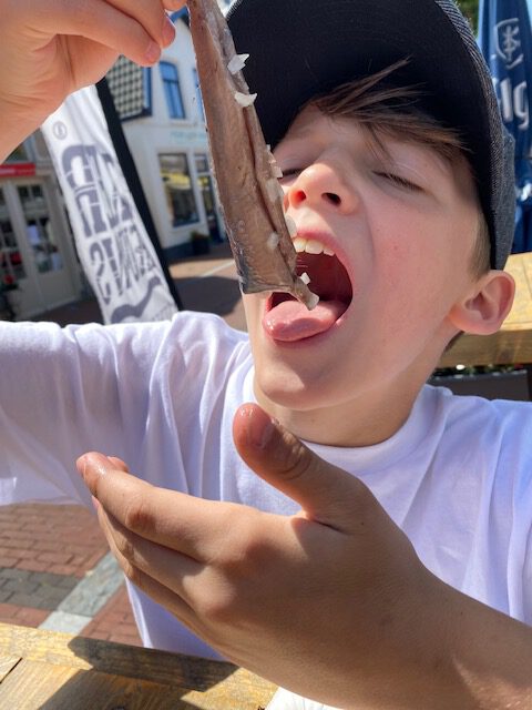 Hering mit Zwiebeln – beim Fischhändler bekommt Ihr einen nackten Hering, den Ihr am Schwanz packt, in Zwiebeln stippt und dann esst.